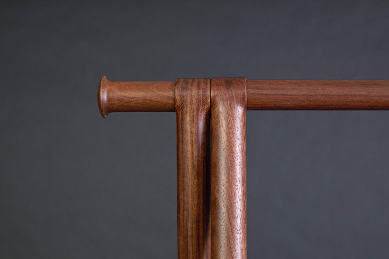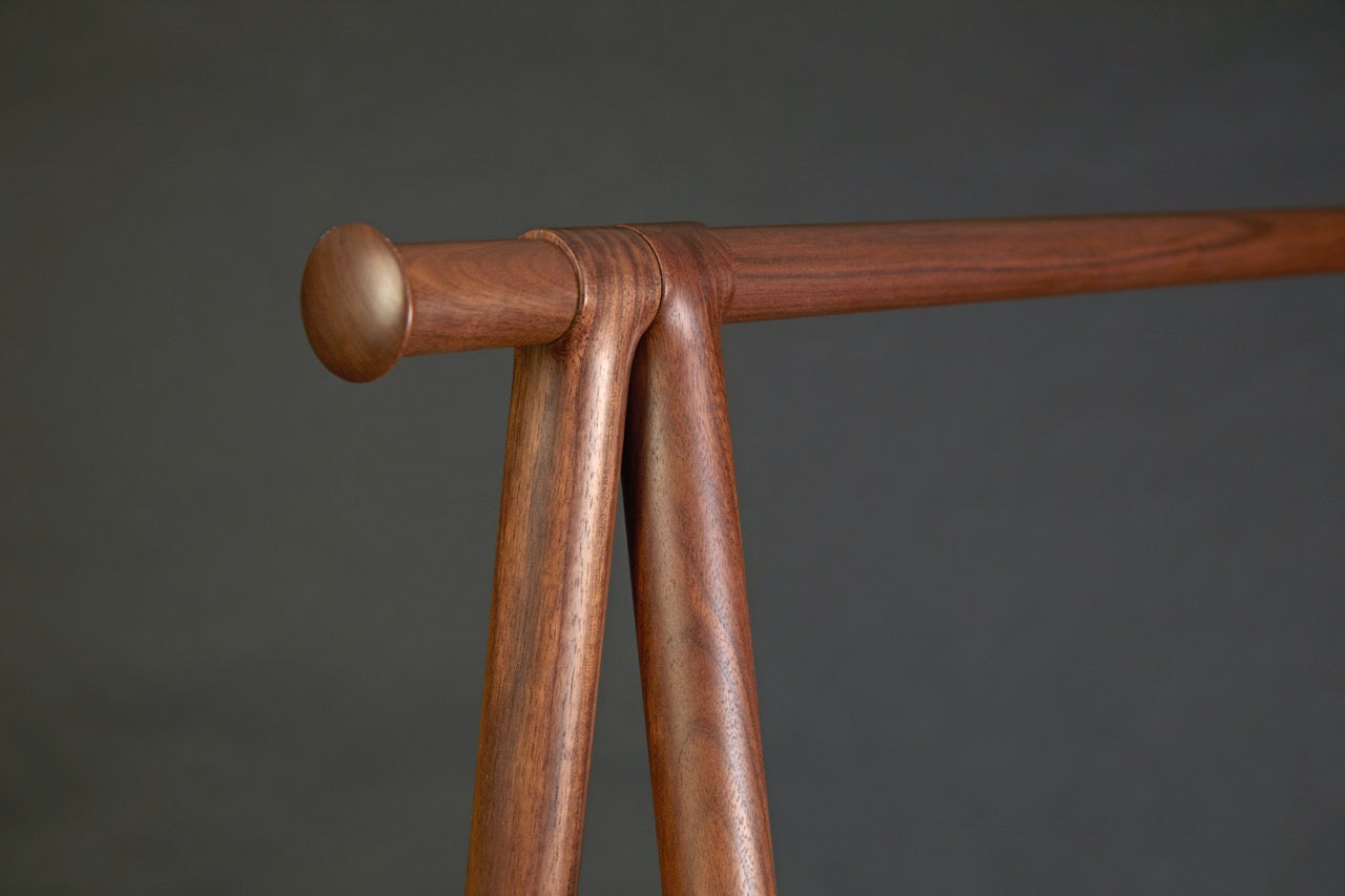 Although the shape of this coat rack is nothing out of the ordinary, its appeal lies in the generous use of thick, carved solid walnut. The shape of the carved ends creates a hook that prevents clothes from easily slipping off.