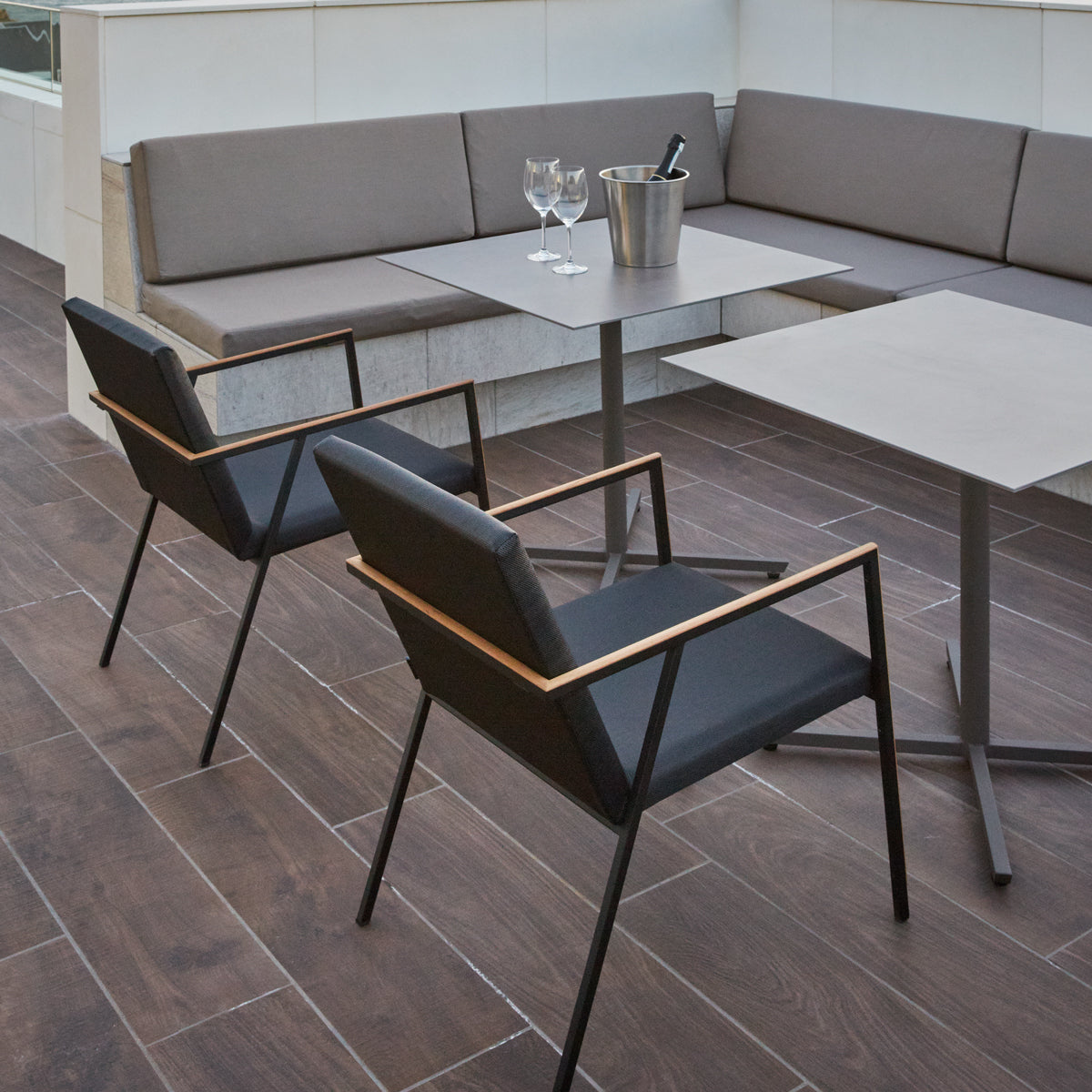 将橡木夹在细金属之间的时尚铁制椅子。 不仅适用于餐厅椅,也可在客厅或室外使用。